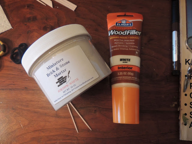 For mortar, I'll be using Elmers Wood filler AND a mixture made especially for the purpose.I don't like the stark white and therefore, I think I'll mix in a bit of brown acrylic paint to give the mortar an old look.
